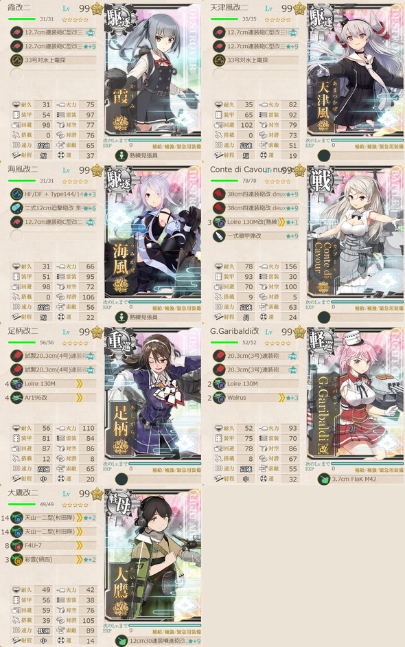 P:Gotland(丁S,甲A),鹿島(丁),薄雲(丁),秋雲(丁),夕雲(丁),巻雲(丁),風雲(丁),長波(丁),秋霜(丁S,甲A),秋月(丙),Z1(丁),Z3(丁),Jervis(甲),瑞穂(丁),Commandant Teste(乙),白雲(丙)