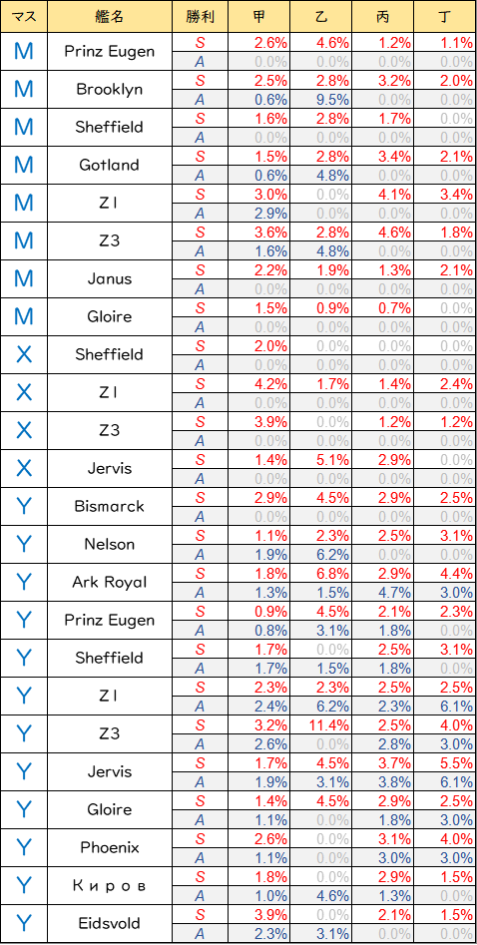 Y:Bismarck(丁),Nelson(丁S,乙A),Ark Royal(丁A),Prinz Eugen(丁S,丙A),Sheffield(丁S,丙A),薄雲(丁A),浦波(丁A),天霧(丁S,丙A),狭霧(丁A),春雨(丁S,丙A),高波(丁),藤波(丁S,丙A),早波(丁A),浜波(丁A),沖波(丁S,丙A),岸波(丁),朝霜(丙S,甲A),早霜(丁),清霜(丁),Z1(丁A),Z3(丁A),Jervis(丁A),瑞穂(丁S,丙A),Gloire(丁A),Phoenix(丁A),Киров(丁S,丙A),Eidsvold(丁S,乙A)