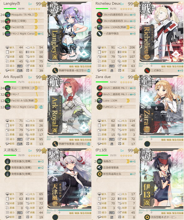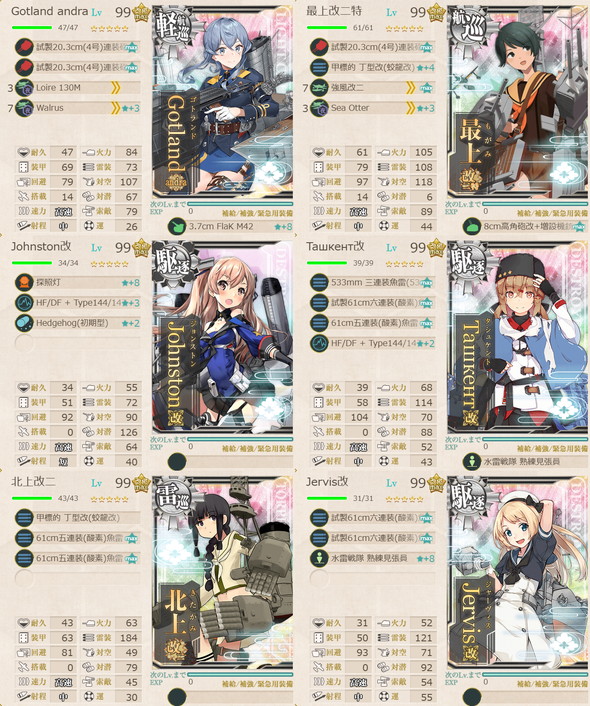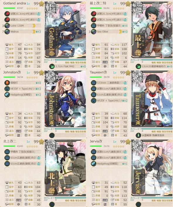M:Prinz Eugen(丁),Brooklyn(丁S,乙A),Sheffield(丙),Gotland(丁S,乙A),浦波(丁),天霧(丁),狭霧(丁),春雨(丁),高波(丁),藤波(丁S,甲A),早波(丁),沖波(丁S,甲A),岸波(丁S,甲A),朝霜(甲),早霜(丁),清霜(丁),Z1(丁S,甲A),Z3(丁S,乙A),Janus(丁),Gloire(丙)