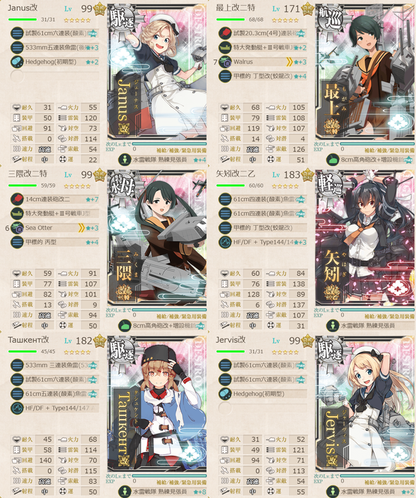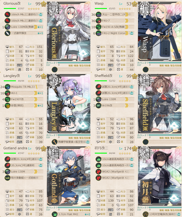 M:Prinz Eugen(丁S,甲A),Brooklyn(丁S,乙A),Sheffield(丙),Gotland(丁S,丙A),浦波(丁),天霧(丁),狭霧(丁),春雨(丁),高波(丁),藤波(丁S,甲A),早波(丁S,甲A),沖波(丁S,甲A),岸波(丁S,乙A),朝霜(丙),早霜(丁),清霜(丁),Z1(丁S,丙A),Z3(丁S,乙A),Janus(丁),Gloire(丙)
