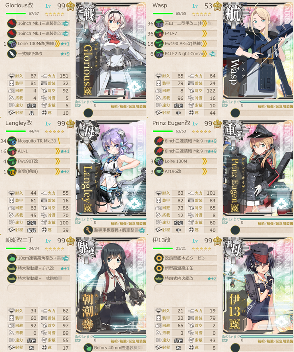 Y:Bismarck(丁),Nelson(丁S,乙A),Ark Royal(丁A),Prinz Eugen(丁S,丙A),Sheffield(丁A),薄雲(丁A),浦波(丁A),天霧(丁A),狭霧(丁A),春雨(丁A),高波(丁),藤波(丁A),早波(丁A),浜波(丁A),沖波(丁S,丙A),岸波(丁),朝霜(丁S,丙A),早霜(丁),清霜(丁),Z1(丁A),Z3(丁A),Jervis(丁A),瑞穂(丁A),Gloire(丁A),Phoenix(丁A),Киров(丁S,丙A),Eidsvold(丁S,乙A)