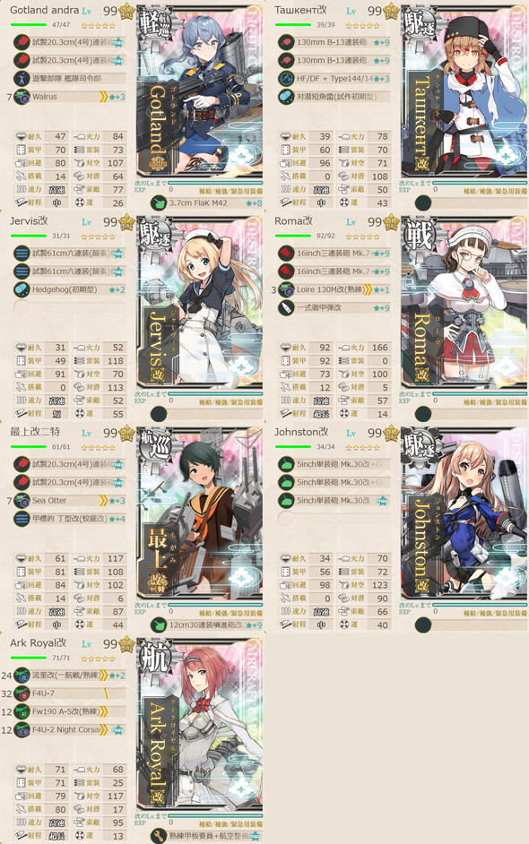 S:Richelieu(乙),Ark Royal(丁),Honolulu(丁),天霧(甲),狭霧(丙),有明(丙),夕暮(甲),夕雲(丙),巻雲(乙),長波(甲),占守(丁),国後(甲),Nevada(乙)