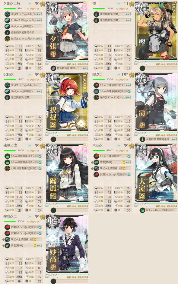 Z:Colorado(丁),Saratoga(丁),Gambier Bay(丁),能代(丁),親潮(丁),早潮(丁),初風(丁),天津風(丁),時津風(丁),磯風(丁),谷風(丁),野分(丁),舞風(丁),Johnston(丁),対馬(丁),鵜来(丁),山汐丸(丁),熊野丸(丁),Drum(丁),南海(丁),Dace(丁)