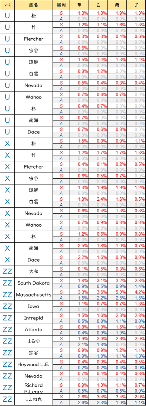 U:海風(丁),山風(丁),江風(丁),風雲(丁),藤波(丁S,甲A),早波(丁),浜波(甲),沖波(丁),岸波(丁S,甲A),朝霜(丁),照月(丁),松(丁),竹(丁),Fletcher(丁),択捉(丁S,乙A),宗谷(甲),迅鯨(丁),稲木(丁S,甲A),白雲(乙),Nevada(丁),Wahoo(丙),杉(乙),南海(甲),Dace(丙)