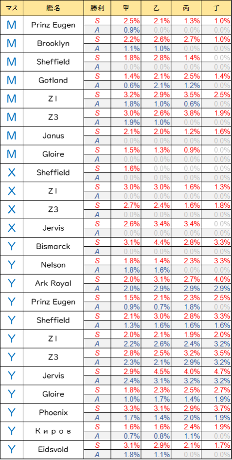 Y:Bismarck(丁),Nelson(丁S,乙A),Ark Royal(丁A),Prinz Eugen(丁S,丙A),Sheffield(丁A),薄雲(丁A),浦波(丁A),天霧(丁A),狭霧(丁A),春雨(丁A),高波(丁),藤波(丁A),早波(丁A),浜波(丁A),沖波(丁S,丙A),岸波(丁),朝霜(丁S,丙A),早霜(丁),清霜(丁),Z1(丁A),Z3(丁A),Jervis(丁A),瑞穂(丁A),Gloire(丁A),Phoenix(丁A),Киров(丁S,丙A),Eidsvold(丁S,乙A)