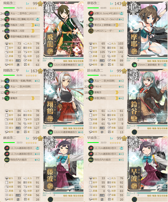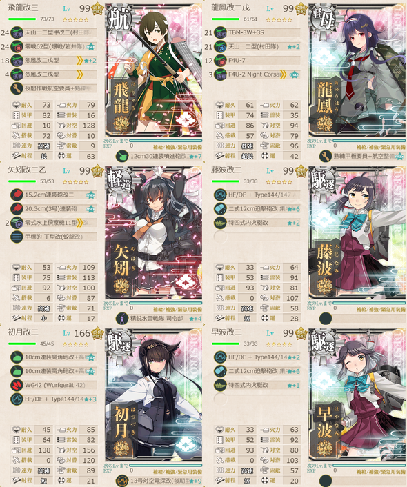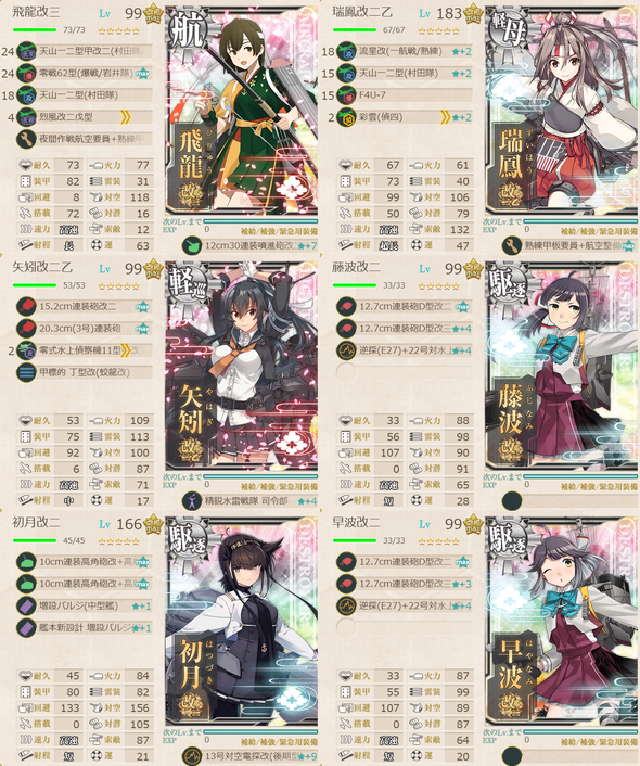 (旗艦)飛龍改三+(風雲/玉波/涼波/藤波/早波/浜波)2を含む艦隊で、以下の海域をS?勝利